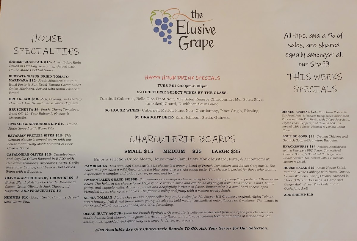 Welcome to The Elusive Grape, a charming wine bar nestled in the heart of DeLand, Florida. Known for its inviting atmosphere, this gem offers a delightful culinary experience paired with an extensive selection of fine wines. With a limited yet intriguing menu, guests can savor options such as Domaine Serene Wine Dinner for just $85, alongside affordable bottles like ALTOSUR Malbec and KRIS Pinot Grigio.