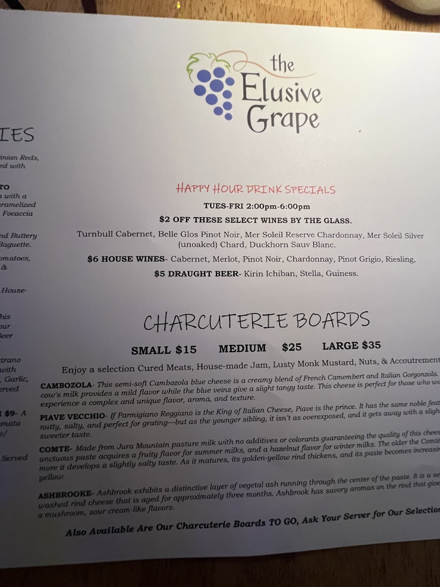The ambiance is perfect for conversation, thanks to comfy seating arrangements and a dog-friendly policy. Popular features include "Dare to Pair" specials on Wednesdays and a new bottomless mimosas offering on Sundays. Reviews savor the exceptional hospitality and quality of both wine and food. Patrons appreciate the chance to relax with a charcuterie board while enjoying live trivia nights, making The Elusive Grape a must-visit when in town.